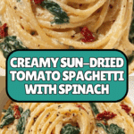 This Spaghetti & Spinach with Sun Dried Tomato Cream Sauce recipe features tender spaghetti tossed in a rich, creamy sauce infused with sun-dried tomatoes, fresh spinach, and Parmesan cheese. The garlic-sautéed base adds aroma and depth, while optional crushed red pepper flakes provide a subtle kick, making it a flavorful and comforting Italian-inspired pasta dish perfect for weeknight dinners.
