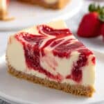 Keywords: strawberry cheesecake, swirl cheesecake, homemade cheesecake, graham cracker crust, strawberry sauce, creamy cheesecake, marbled cheesecake