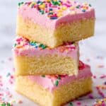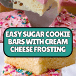 Keywords: Sugar cookie bars, sugar cookies, cookie bars recipe, easy dessert, vanilla frosting, soft cookie bars