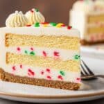A slice of cake sits on a white speckled plate, showing four layers: the bottom layer is a thin, crumbly brown crust, above it is a thick, creamy white layer with small red and green sprinkles mixed inside, the third layer is a soft yellow cake, and the top is a smooth white frosting decorated with two small swirls of white cream and scattered red, green, and yellow round sprinkles. A silver fork rests beside the cake on the plate, and the background has a soft focus with warm tones and a wooden texture under the plate. photo taken with an iphone --ar 4:5 --v 7