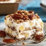 A square slice of creamy layered dessert sits on a white plate, showing three visible layers: a bottom crust that looks crumbly and brown, a thick middle layer of white cream mixed with small pieces of light yellow fruit and brown nuts, and a thick top layer of white cream generously covered with whole and halved pecans, which are rich brown and shiny. A few pecans are scattered on the plate near the dessert, and a shiny silver fork rests beside it. The background features a white marbled surface with a larger dessert pan blurred behind. Photo taken with an iphone --ar 4:5 --v 7
