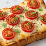 A toasted open sandwich on white bread is topped with a layer of melted cheese that looks creamy and bubbly, followed by slices of bright red cherry tomatoes scattered evenly. Small green herbs and black pepper are sprinkled on top, adding texture and color. The edges of the bread are golden brown and crispy, and the sandwich rests on a white marbled surface. Photo taken with an iphone --ar 4:5 --v 7