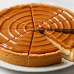 A round dessert with a golden-brown crust forms the base layer, topped by a smooth, thick caramel-colored layer that is evenly spread across the surface. The dessert is divided into eight slices with clean cuts, and a knife rests in the middle, partly slicing one piece. The dessert sits on a white plate, placed on a white marbled surface. photo taken with an iphone --ar 4:5 --v 7
