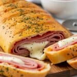 This Weeknight Stromboli recipe features a delicious combination of deli ham, Genoa salami, pepperoni, and melted mozzarella and Parmesan cheeses wrapped in a soft pizza dough with marinara sauce. Perfect for a quick, satisfying dinner, it’s baked until golden brown and served with extra marinara for dipping.