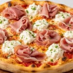 This White Pizza with Prosciutto & Hot Honey is a delightful blend of creamy ricotta, fresh mozzarella, and salty prosciutto, all topped with a drizzle of spicy-sweet hot honey. Baked to golden perfection with a crispy crust, this pizza offers a perfect balance of savory and sweet flavors, garnished with fresh basil for an aromatic finish.