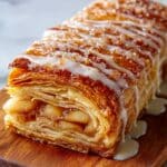 This Wisconsin Apple Kringle is a classic Danish pastry beloved in Wisconsin, featuring a flaky, buttery crust filled with sweet apple pie filling and a hint of cardamom. The dough is enriched with yeast for a soft, tender texture, baked to golden perfection, then finished with a smooth vanilla glaze, making it a perfect treat for breakfast, brunch, or dessert.